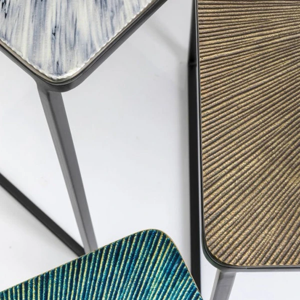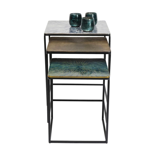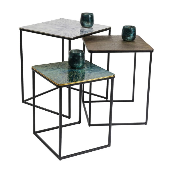 Van deze Kare Design Ray bijzettafelset fleurt elke zithoek op! De tafeltjes uit de bijzettafelset hebben elk een ander blad van gelakt metaal; samen vormen ze een kleurrijk geheel. Bovendien kun je met de bijzettafelset eindeloos variëren. Zet ze speels bij elkaar in de plaats van een salontafel of geef elk tafeltje een eigen plek in de zithoek. Ook kun je de bijzettafelset half in elkaar schuiven voor een rustig effect.