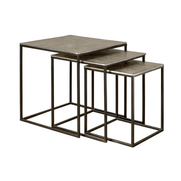Met de Renew Iron Alu bijzettafelset kun je alle kanten op! Zet de bijzettafelset in de hoek bij een fauteuil, of verdeel de tafeltjes juist over de zithoek. Schuif de kleinste tafels deels onder de grootste, of zet ze speels naast elkaar in de plaats van een salontafel. De bijzettafelset van metaal en nikkel past perfect in een industriële woonstijl met moderne accenten.