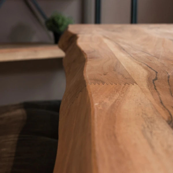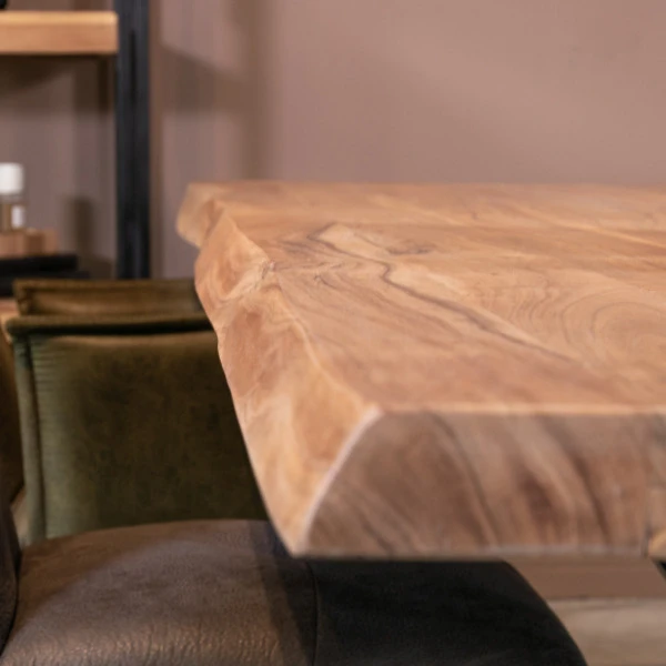 De Bodio Dax eettafels zijn unieke, massieve boomstamtafels met een natuurlijke en robuuste uitstraling. De tafels zijn gemaakt van de beste kwaliteit Aziatisch acaciahout en hebben mooie natuurlijke kenmerken en vormen in het hout. Het tafelblad bestaat uit 2,5 cm massief acaciahout met randen van 5 cm dik. De poten van metaal zijn 7,5 x 7,5 cm. De tafel is afgelakt met een sterke, beschermende lak. Het onderstel is voorzien van kunststof vloerdoppen.