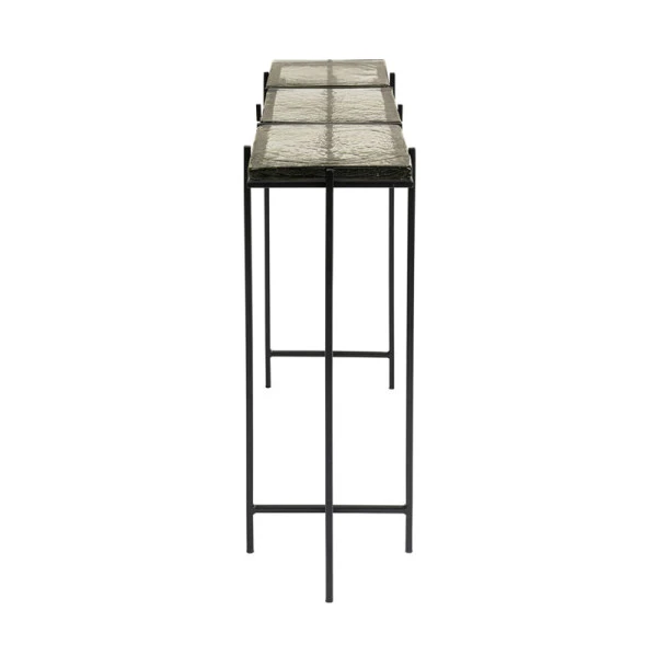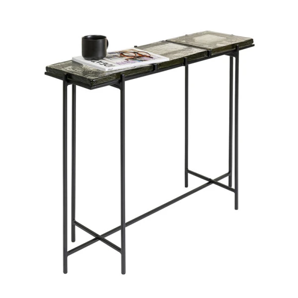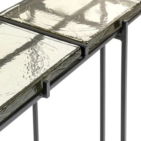 Bijzonder aan de Kare Design Ice Black sidetable is natuurlijk het blad van dik glas. Het bovenblad bestaat eigenlijk uit drie glasplaten, met de hand gemaakt en heerlijk robuust! Maar de sidetable heeft ook een bijzonder design. Het onderstel van metaal steekt een stukje uit en loopt kruislings: voor een speels effect.