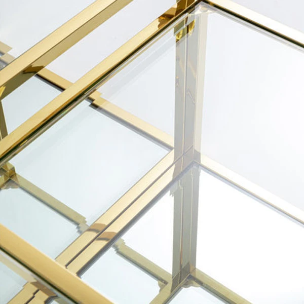 Bijzonder aan de Kare Design Orion Gold salontafelset is de mix van materialen. Wat het eerste opvalt zijn natuurlijk de gouden frames van de tafeltjes. Maar als je verder kijkt zie je dat de onderplaten gemaakt zijn van spiegelglas! Het bovenste blad van de design salontafelset bestaat uit transparant glas.