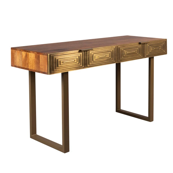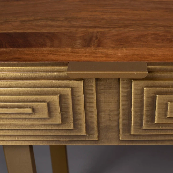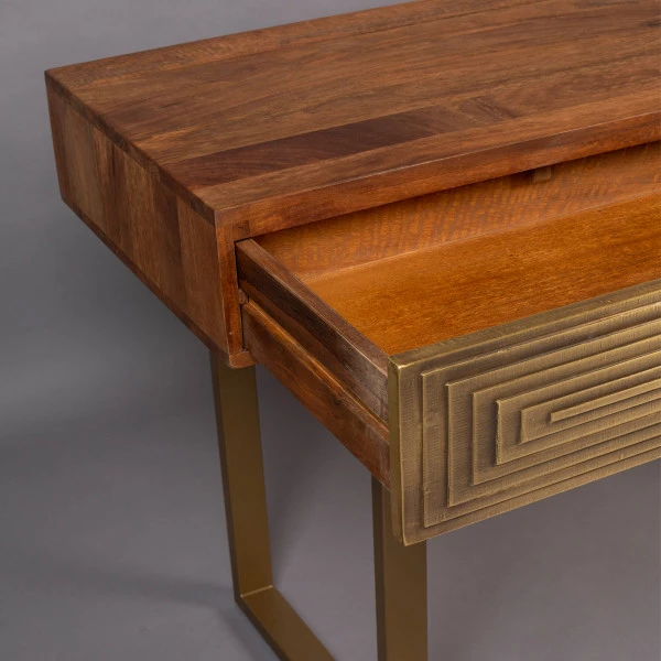 Deze Dutchbone Volan sidetable met goud heeft een bijzonder warme en chique uitstraling. Het mangohouten blad is voorzien van een honingkleurige lak, die mooi samengaat met het gouden art-deco patroon op de lades! Zet de sidetable in de hal en leg er post op; in de lades is plaats voor hondenriemen en mutsen. Of gebruik de mangohouten sidetable als sfeermaker naast de bank!