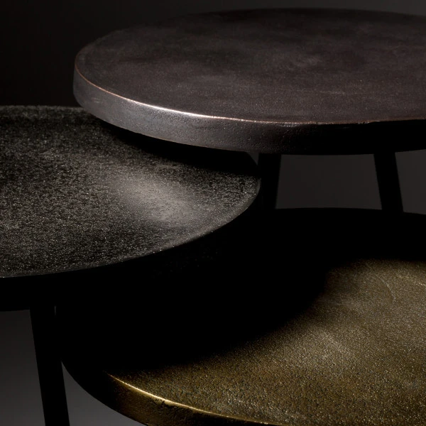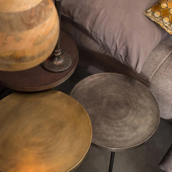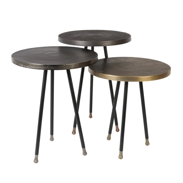 De metalen Dutchbone Alim bijzettafelset bestaat uit drie tafeltjes met een hoogte variërend van 40 tot 48 centimeter. Bovendien heeft elk tafeltje een ander blad: met een laag brons, koper of antiek metaal. Zo vormt de bijzettafelset een chique, vintage geheel!