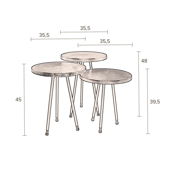 Met de Dutchbone Alim bijzettafelset kun je eindeloos variëren. Zet de drie tafeltjes bij elkaar op een vloerkleed als speels alternatief voor de salontafel. Of verdeel de metalen bijzettafelset juist over de zithoek, met naast elke zitplaats een handige plek voor koffiekopjes en wijnglazen. Zin in iets nieuws? Dan hoef je alleen de opstelling in de zithoek te veranderen.