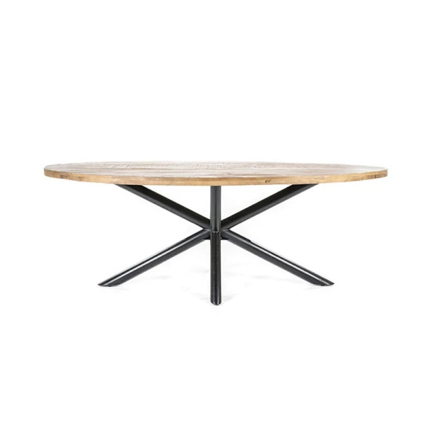 De Eleonora Oscar eettafel past perfect in een industrieel interieur. Het ovale blad van mangohout vormt een robuust geheel met de spinpoot van zwart gelakt metaal: stoer met een vleugje design! In het vijf centimeter dikke blad zie je de karakteristieke vormen en kleurvariaties van het hout mooi terug.