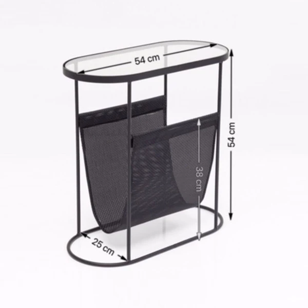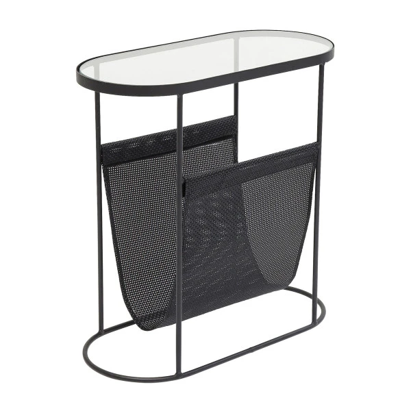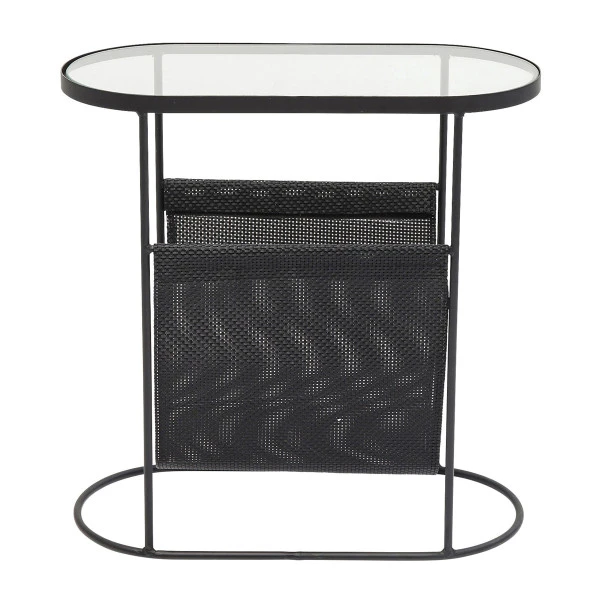 Deze ovalen Kare Design Mesh bijzettafel heeft een bijzonder creatief ontwerp, met een krantenbak van kunststof onder het glazen blad. Zo heb je voortaan alles bij de hand: leesvoer, een kop koffie en wat lekkers. De ovalen bijzettafel heeft een blad van gekleurd glas, dat mooi samengaat met het gepoedercoat metaal en de zwarte krantenbak.