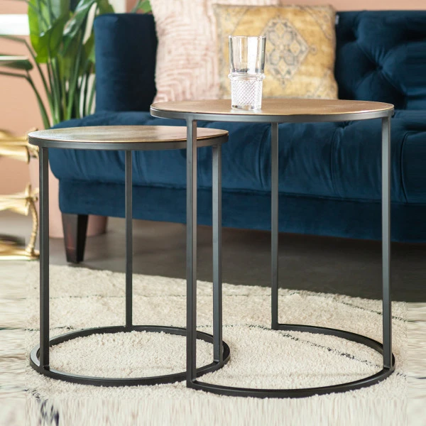 De By-Boo Setto serie kenmerkt zich door een elegant design met een modern-industrieel karakter. Deze ronde bijzettafelset is ook verkrijgbaar met een grijs metalen blad. Of zoek je nog een salontafelset met messing bladen om mee te combineren?