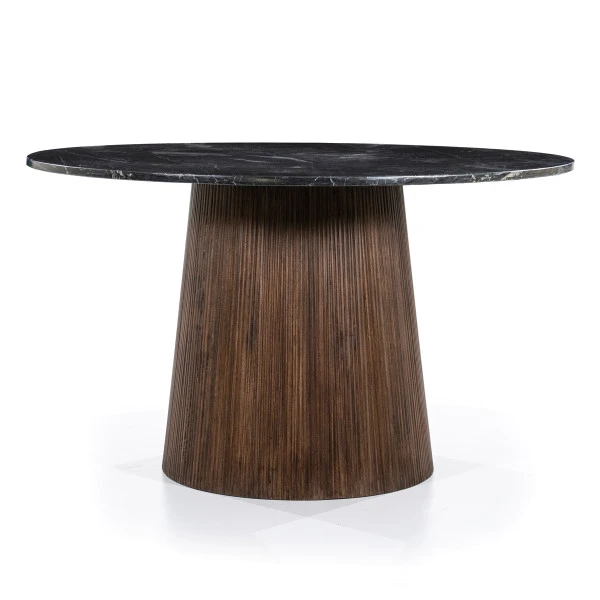 De Eleonora Maxim eettafel vormt een bijzondere verschijning in je interieur. Het ronde blad van echt marmer gaat prachtig samen met de conische voet van mangohout. De natuurlijke materialen zorgen voor sfeer, maar in dit design zeker ook voor veel stijl! Met een diameter van 130 centimeter kun je aan deze ronde eettafel met 4 personen eten. Op een gezellige avond schuif je er zo nog 2 stoelen extra bij!