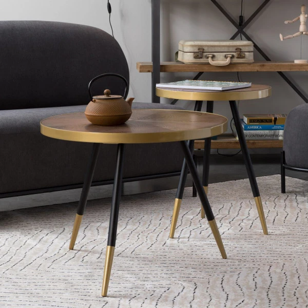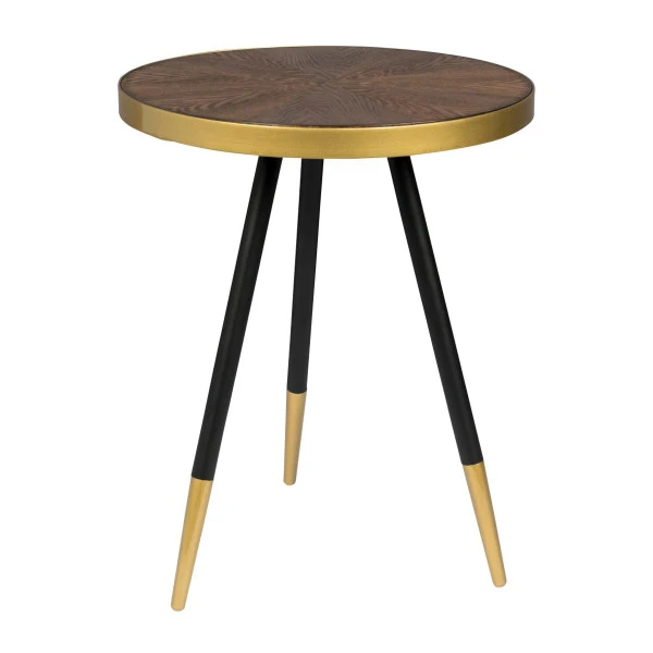 Een ronde bijzettafel met een essenhouten blad, dat versiert is met een laagje walnootfineer voor extra sfeer. In combinatie met de gouden rand zorgt dat voor een luxe geheel! Ook de zwarte ijzeren poten dragen gouden sokjes voor een sfeervolle en luxueuze uitstraling. Hierdoor past de salontafel mooi in zowel een modern als retro of zelfs industrieel interieur.