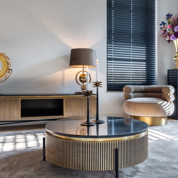 De meubels uit de Richmond Interiors Ironville serie vallen op dankzij de gouden gloed; die komt van de metaalplaten met ribbelmotief. Tegelijkertijd zorgt een blad van echt marmer voor stijl en karakter. Kijk gauw verder voor een bijpassende bijzettafel van goud met marmer! Of combineer de ronde salontafel met een dressoir uit de serie.