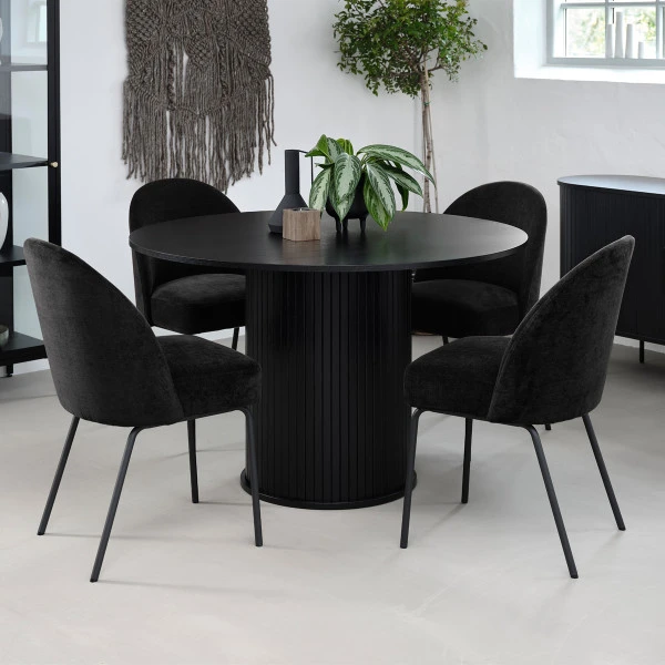 Combineer de ronde eettafel met een bijpassend dressoir en een compacte wandkast in dezelfde stijl! Je vindt ze allemaal in de Sway serie van Bodio. Is het zwart te donker voor jouw woonkamer? Geen zorgen, alle meubels zijn tevens verkrijgbaar in naturel hout.