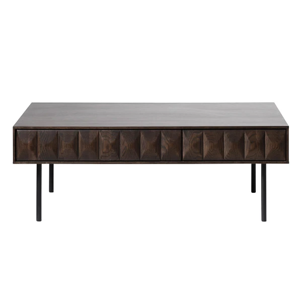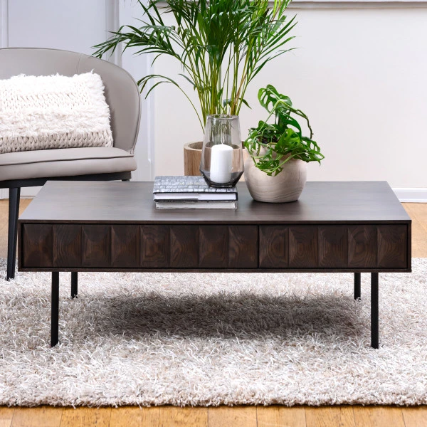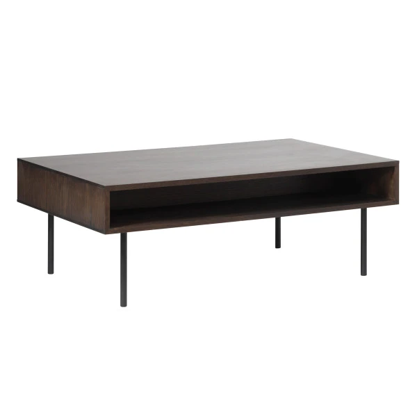 Wat deze salontafel zo bijzonder maakt is de opbergruimte: met een lade en een open vak kun je er best wat spulletjes in kwijt. Een stapel tijdschriften misschien, of onderzetters en afstandsbedieningen. Maar de salontafel valt ook op dankzij de sfeervolle uitstraling. Het donkerbruine eikenfineer geeft een vintage look, terwijl het frame van metaal voor stijl zorgt.