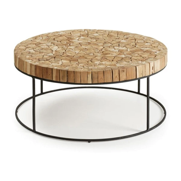 Deze ronde salontafel van Kave Home valt op vanwege een bijzondere mix van materialen. Het robuuste tafelblad van teak, met een prachtig mozaïek aan houtvormen, vormt een stijlvol contrast met het onderstel van zwart metaal. Dat maakt de design salontafel geschikt voor uiteenlopende woonstijlen, van modern tot landelijk!
