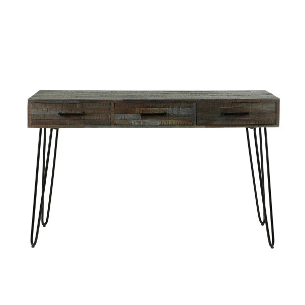 Deze sidetable heeft sfeervolle lades met stroken ingelegd hout, op speelse poten van metaal. De greywash afwerking van het hout versterkt het industriële effect. Zet de sidetable in de hal, met een gezellige decoratie erop: in de drie lades kun je post, sleutels en mutsen opbergen. Maar de sidetable verdient ook een plek in de woonkamer dankzij het warme, karakteristieke hout en moderne design!