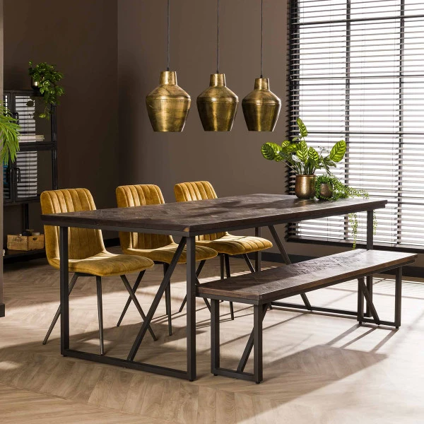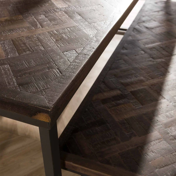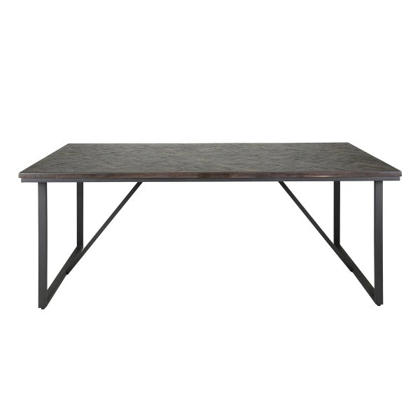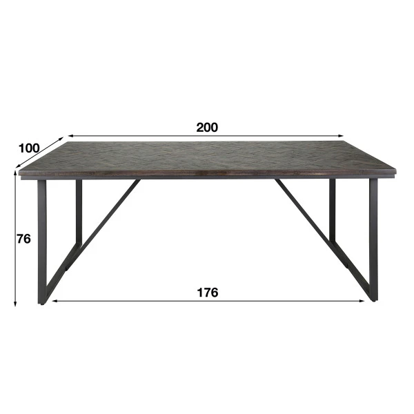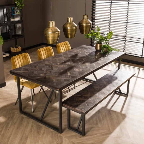 Deze teakhouten eettafel vormt de perfecte mix van stoer en stijlvol. Het design is robuust en industrieel dankzij het metalen onderstel en dikke houten blad. Maar omdat het tafelblad is ingelegd met een prachtig Versailles houtpatroon in een diepe, donkerbruine tint heeft de eettafel ook een chique karakter! Met een breedte van 200 centimeter kun je aan deze teakhouten eettafel met een heel gezelschap eten.