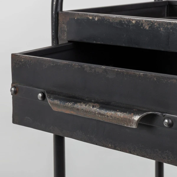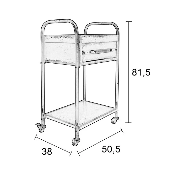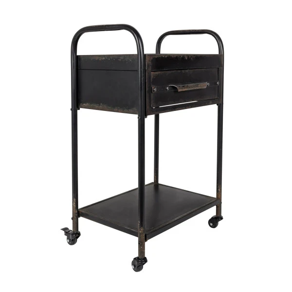 De trolley heeft behalve twee planken ook een lade, waarin je losse rommeltjes kunt opbergen: onderzetters of openers, maar ook sleutels en portemonnees. Twee van de vier zwenkwieltjes beschikken over een blokkeerstand zodat de trolley met verweerde look er niet uit zichzelf vandoor gaat met je wijn.