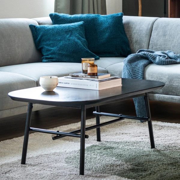 De VTwonen salontafel heeft een mangohouten blad met een mat zwarte afwerking. Slanke poten van mat zwart metaal maken het elegante design compleet. Op het ovale blad van 100 centimeter breed is ook nog plaats voor een gezellige decoratie naast je wijnglazen en borrelnootjes. Bovendien gaat de zwarte salontafel samen met elke kleur bank, vloer of vloerkleed.