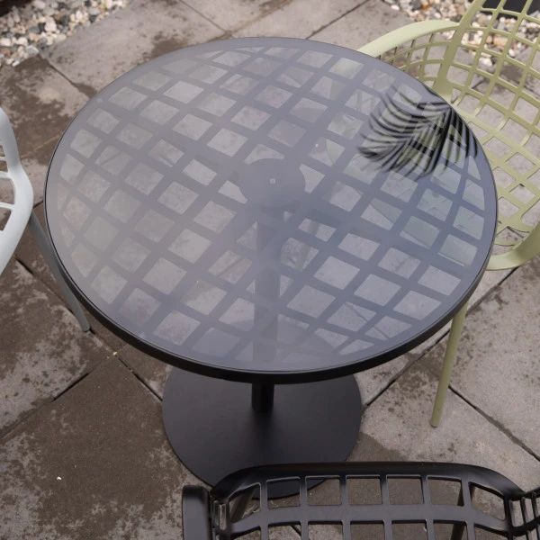 Met deze Zuiver Albert Garden tafel creëer je een gezellig bistro sfeertje in de tuin. De ronde tafel is namelijk bestand tegen de weerelementen, zodat je deze de hele zomer buiten kunt laten staan. Schuif een bijpassende stoel aan de zwarte bistro tafel en geniet in het zonnetje van je ontbijt! Het ronde blad is gemaakt van gerookt glas, met daaronder een speels frame en een slanke, zwarte poot.